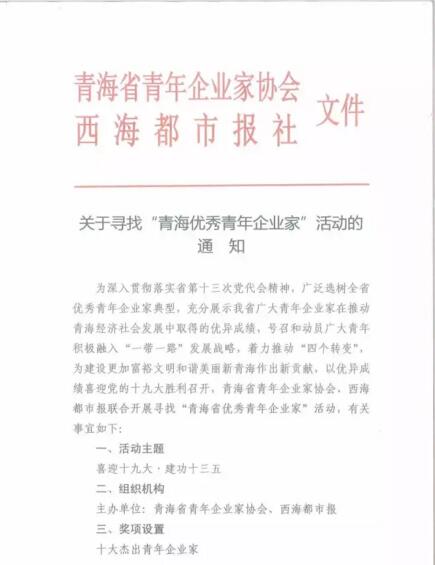為深入貫徹落實(shí)省第十三次黨代會精神,廣泛選樹全省優(yōu)秀青年企業(yè)家典型,充分展示我省廣大青年企業(yè)家在推動青海經(jīng)濟(jì)社會發(fā)展中取得的優(yōu)異成績,號召和動員廣大青年積極融